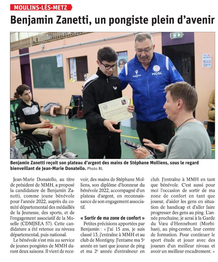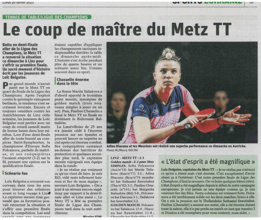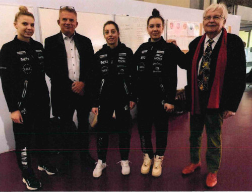 Février 2023 : Souvenir d'un 1/4 de final victorieux de Metz TT face à Berlin. Sur la photo : Adina Diaconu (Roumanie, n°74 mondiale) Eric Rogovitz, agent général GAN (partenaire), Pauline Chasselin (France, n°141 mondiale), Maria Tailakova (Russie, n°77 mondiale), Richard Haffner, membre du CA de FFMJSEA 57 |