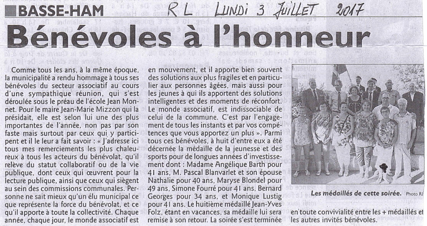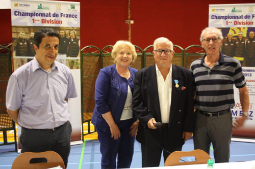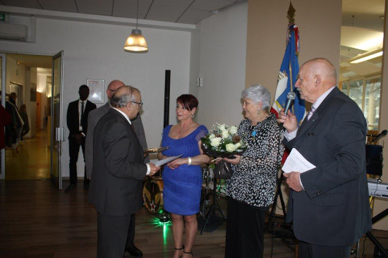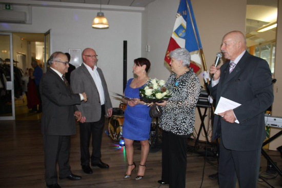 | Cérémonie exceptionnelle. 8 personnes qui se sont vus décerner la médaille de Bronze du Ministère de la Ville, de la Jeunesse et des Sports dans la même promotion (1/1/2017) du jamais vu en Moselle. Aussi pour la remise de ces médailles de Bronze, notre comité s’était déplacé et était dignement représenté par son Président d’Honneur Willy Seiwert, son Président Général Gérard Lejealle, son trésorier Général P.E.Harff Gilet ainsi que nos deux porte-drapeaux Sylviane Gras–Hingray et Bernard Friquet. On notait également la présence de Mr François de Talancé Directeur Adjoint de la DDCS, qui avec Mme P. Georges, Adjointe au Maire chargée des Sports, et Gérard Lejealle président Départemental ont décoré ces récipiendaires. Nul doute que cette remise fera date dans les annales de la ville de Basse Ham. Rendez vous est prévu l’an prochain pour honorer d’autres médaillés . Encore toutes nos félicitations pour ces bénévoles méritants. |