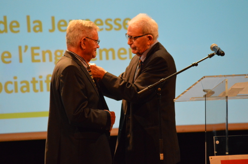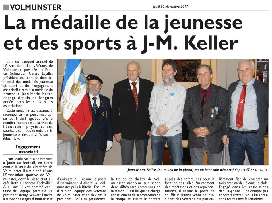 | Lors de l'Assemblée Générale du District Mosellan de Football à YUTZ le samedi 21 octobre 2017 en présence de Messieurs, Jean FRANCOIS vice Président du conseil départemental, Bruno SAPIN maire de YUTZ, Thierry HORY Président de la commission des sports du conseil régional grand est, Albert GEMMERICH Président de la ligue de football du grand est, membre du comité exécutif de la fédération Française de football, Christophe SOLLNER Président du district mosellan de football, ainsi que de nombreux Présidents de clubs de football mosellan, Monsieur René LOPEZ 1er vice Président de la ligue du grand est de football a remis à Monsieur Alex STAUB membre fondateur (1980) puis trésorier de 1982 à 2017 la médaille OR de la jeunesse et des sports |