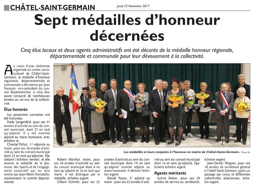 | Mardi 05 décembre 2017 Cérémonie de remise des médailles en Préfecture de Moselle Pour marquer la journée mondiale du bénévolat instaurée en 1985, Mr le Préfet de la Moselle Didier Martin, avait invité les médaillés Or et Argent des Promotions 2017. Dans un discours précis et argumenté, celui-ci a rappelé le rôle essentiel joué par le bénévolat dans notre région et dans notre pays. 21 personnes médaillées d’Argent et 7 d’Or se sont vu remettre leur médaille des mains de notre Préfet, nouvellement nommé. Ce fut un moment inoubliable pour certain s de se retrouver dans le salon d’honneur de la Préfecture et de se voir honorer entourés de leurs proches. Après les photos clôturant cette cérémonie, un moment convivial a permis aux uns et aux autres de converser et de sacrifier au verre de l’amitié. Félicitations à nos deux amis Michel Lapaque et Albert Klein pour leur médaille d’Or et à Jérôme Hecquet, notre responsable informatique pour sa médaille d’argent reçue conjointement par son épouse et ses beaux-parents. Qui a dit que le bénévolat se perdait ? |