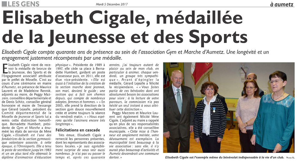 | Jeudi 14 décembre 2017, à l'occasion de son AG, l'association Sport Pour Tous avait fait le plein de ses adhérents pour honorer sa présidente. En effet après plus de 35 années d'activités dont 13 de vice-présidente et 18 de Présidente, Mme Evelyne Mallinger s'est vu attribuer la médaille de bronze de la Jeunesse des Sports et de l'Engagement Associatif. Gérard Lejealle, accompagné de notre porte drapeau, a officié pour cette remise de médaille amplement méritée. Il a également récompensé une adhérente bénévole, Mme Odile Dugert qui s'est vu remettre le diplôme du bénévolat de la Fédération, accompagné d'un plateau souvenir. Les 60 personnes présentes ont applaudi les 2 récipiendaires et ont remercié le Comité de Moselle pour sa présence. |